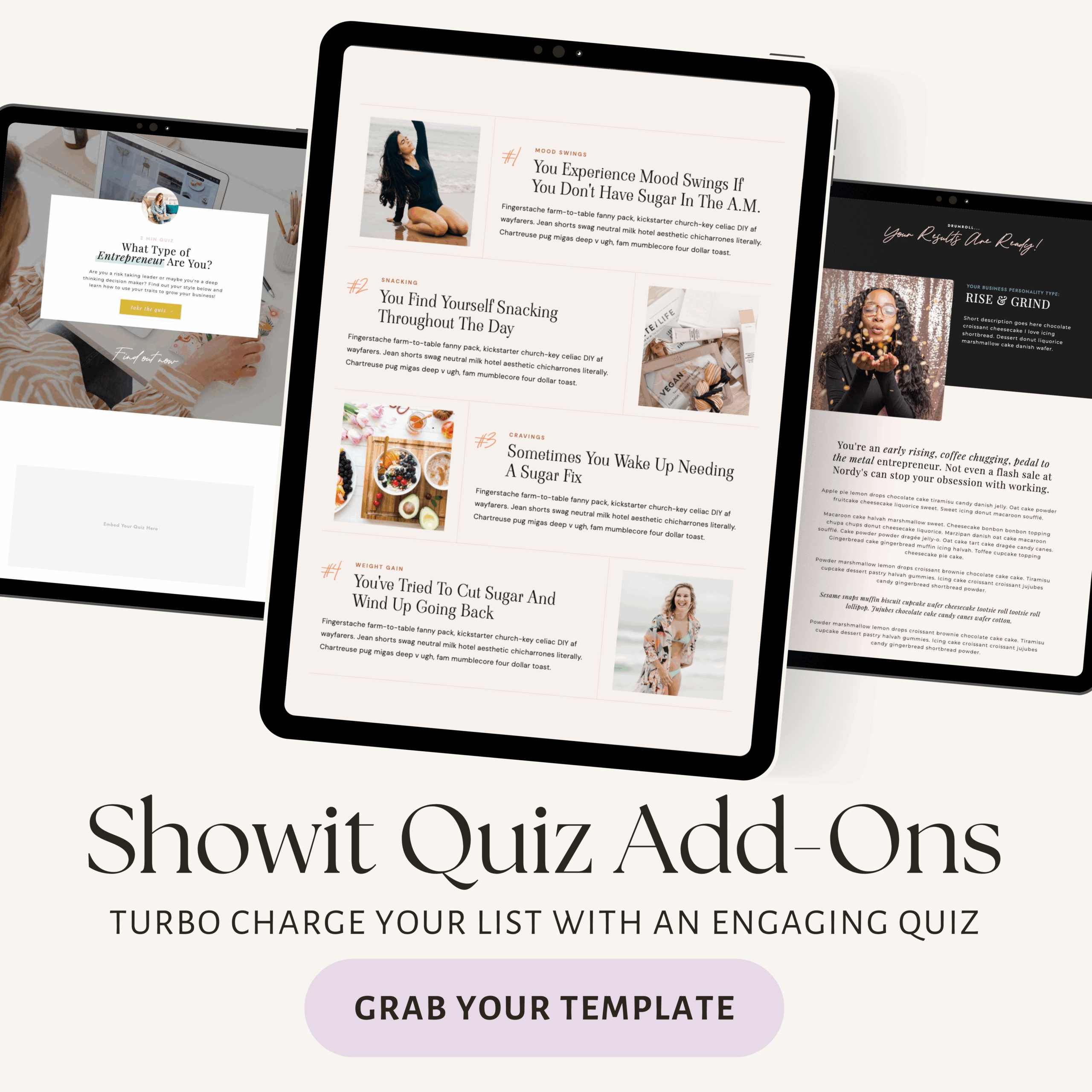I’ve created add-on quiz templates for Showit websites with tons of gorgeous layouts you can use to create quiz landing pages and customized results page all while keeping your quiz takers totally engaged.