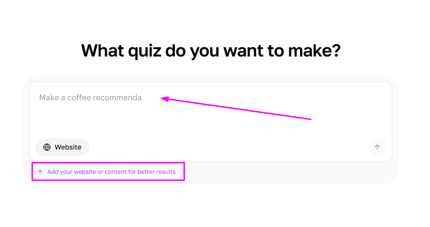 Next, you’ll be able to describe what you think you want your quiz to be about. It’s totally ok if you have no idea (I had no idea either). Instead, you can add a link to a page on your website and AI will come up with the ideas. 💡